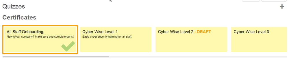 You can view certificates in the Quizzes tab. A list of the defined certificates available to a staff member will appear above the quizzes. Users will only see the certificates that involve articles they can access.